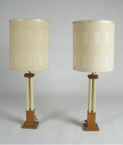 of Architectural lamps in mahogany and brass, white enameled
