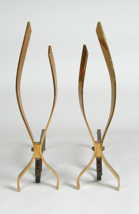 Pair of Andirons with sculptural form in anodized gold finish and black iron back supports.