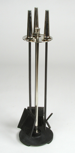 c. 1940s iron and nickel firetool set, tools with dramatic tapered cone handles in nickel, holder in iron with nickel top. |