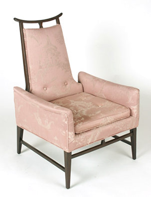 of James Mont, pagoda form top, elegant tapered legs, original Asian theme upholstery. |