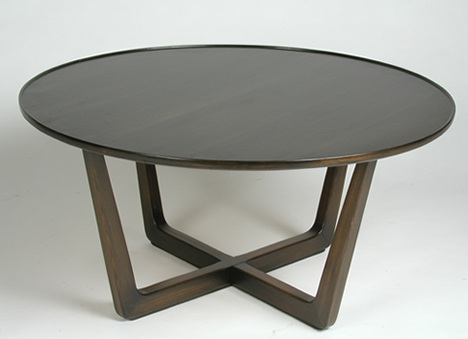 Round cocktail table with silver elm top and crusiform base, finished in medium dark brown finish, designed by Wormley for Drexel's Precedent line c.1947, refinished. |